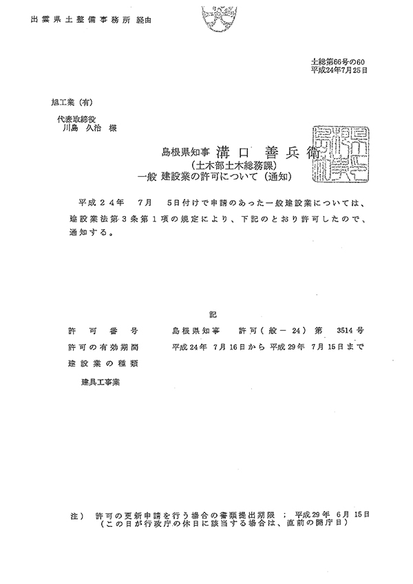 ◎社名 旭工業有限会社 ◎代表者名 代表取締役 川島 久治 ◎創立 昭和52年6月 ◎所在地 島根県出雲市斐川町中洲1153 TEL : 0853-72-6770 FAX : 0853-72-8249 ◎資本金 5,000,000円 ◎営業内容 スチール(サッシ・ドア)等 ステンレス(サッシ・ドア)等 アルミ・スチール曲物製作販売 ※建築登録内容(般-24)第3514号 ◎工場及び従業員の概要 ・敷地面積 2,906.55㎡ ・建物延面積 1,881㎡ ・従業員数 23名